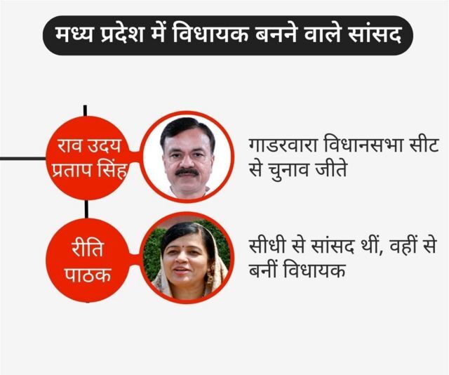 मध्य प्रदेश में 7 सांसदों ने चुनाव लड़ा, जिनमें फगन सिंह कलास्ते, राकेश सिंह, उदय प्रताप सिंह, रीति पाठक, प्रहलाद सिंह पटेल, गणेश सिंह और नरेंद्र सिंह तोमर शामिल हैं. इनमें गणेश और कलास्ते चुनाव हार गये.